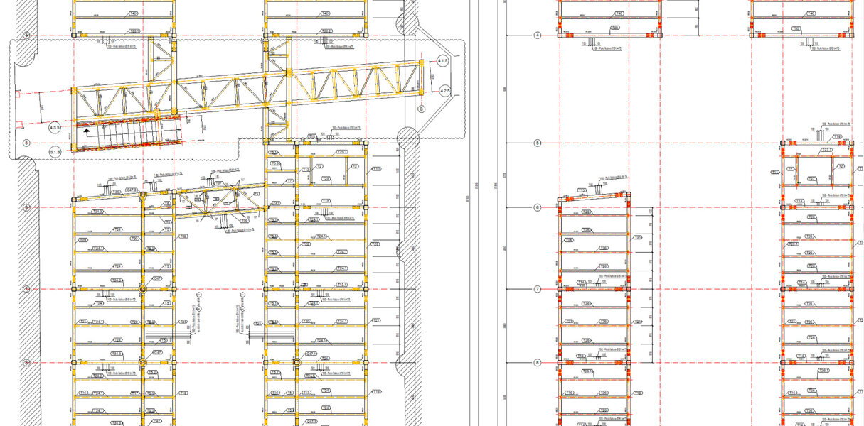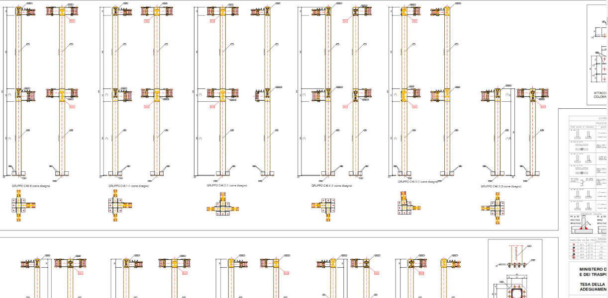 tutti i nodi disegnati per il collegamento delle colonne agli impalcati dell' espansione del centro di visita