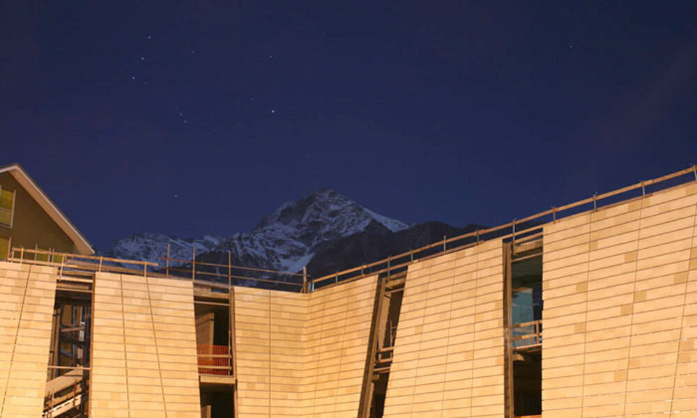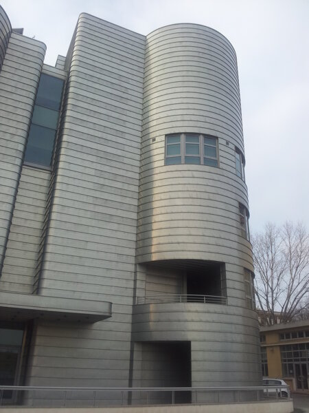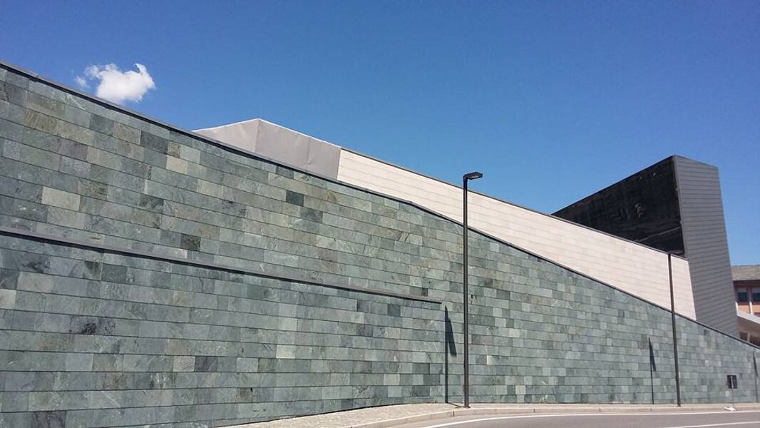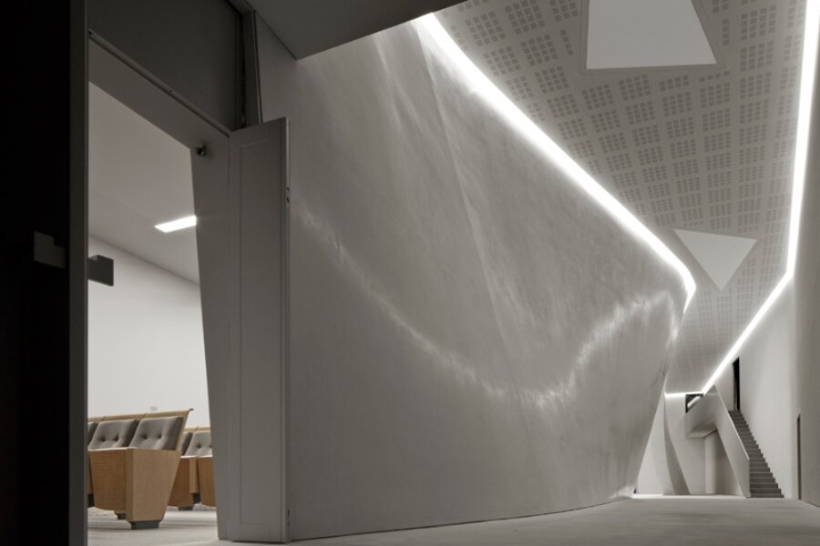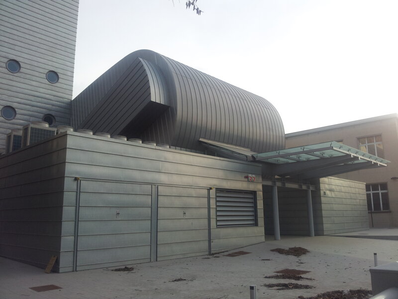 con forme sinuose in lastre di titanio, a coprire uno scheletro in acciaio calandrato, saldato e montato in solo due mesi grazie alla precisione del progetto BIM tridimensionale