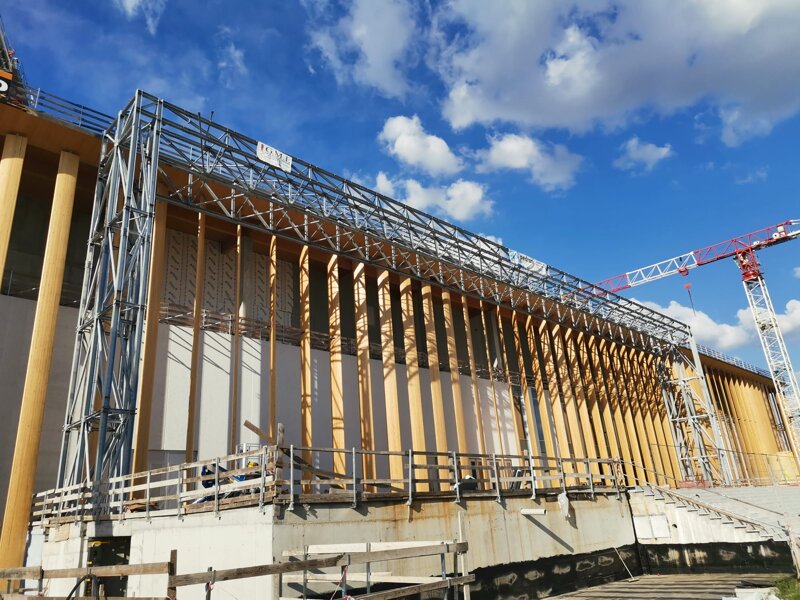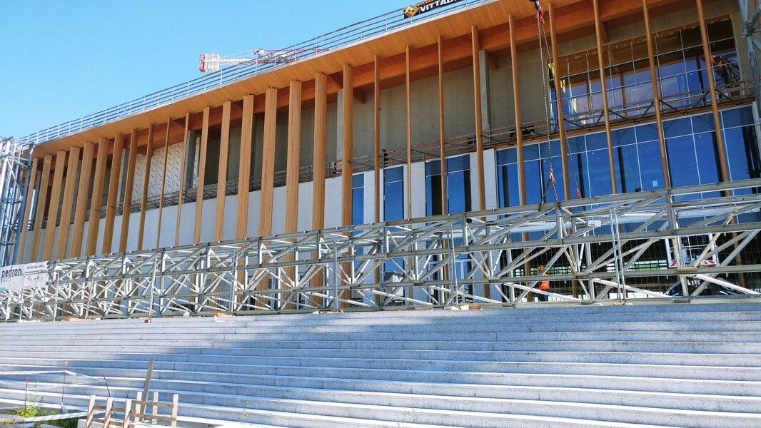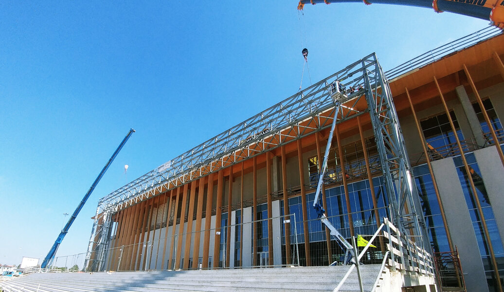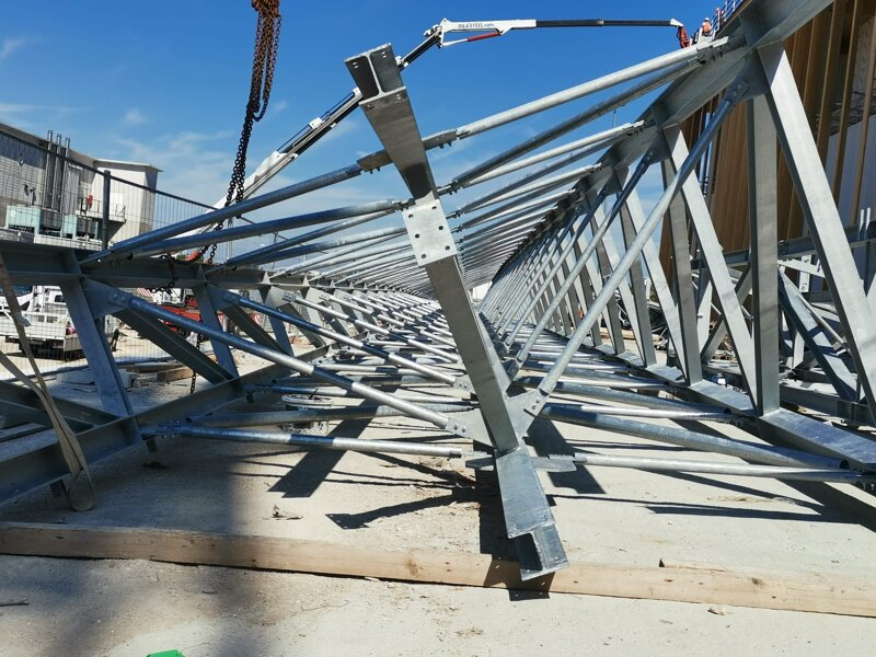 sollevata e montata in un unico tiro a collegare i due piloni tralicciati distanti 62m pronti a rivestirsi di lamiera stirata come nel progetto di Kengo Kuma