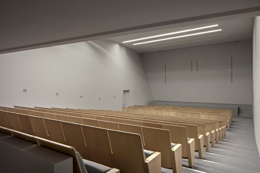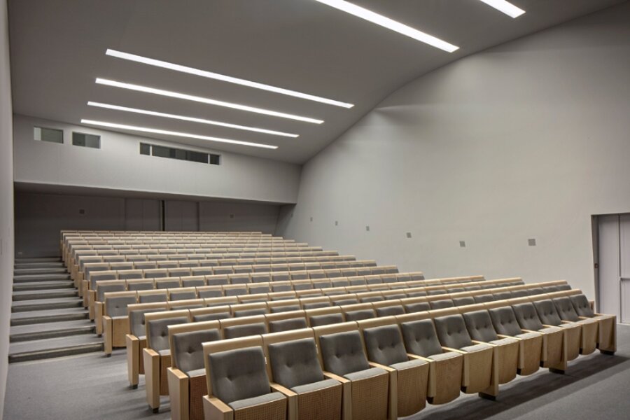il teatrino progettato da Tadao Ando è dotato di un auditorium con una capacità di 225 posti, completo di foyer e di aree tecniche (camerini, sala regia, cabina per la traduzione simultanea)