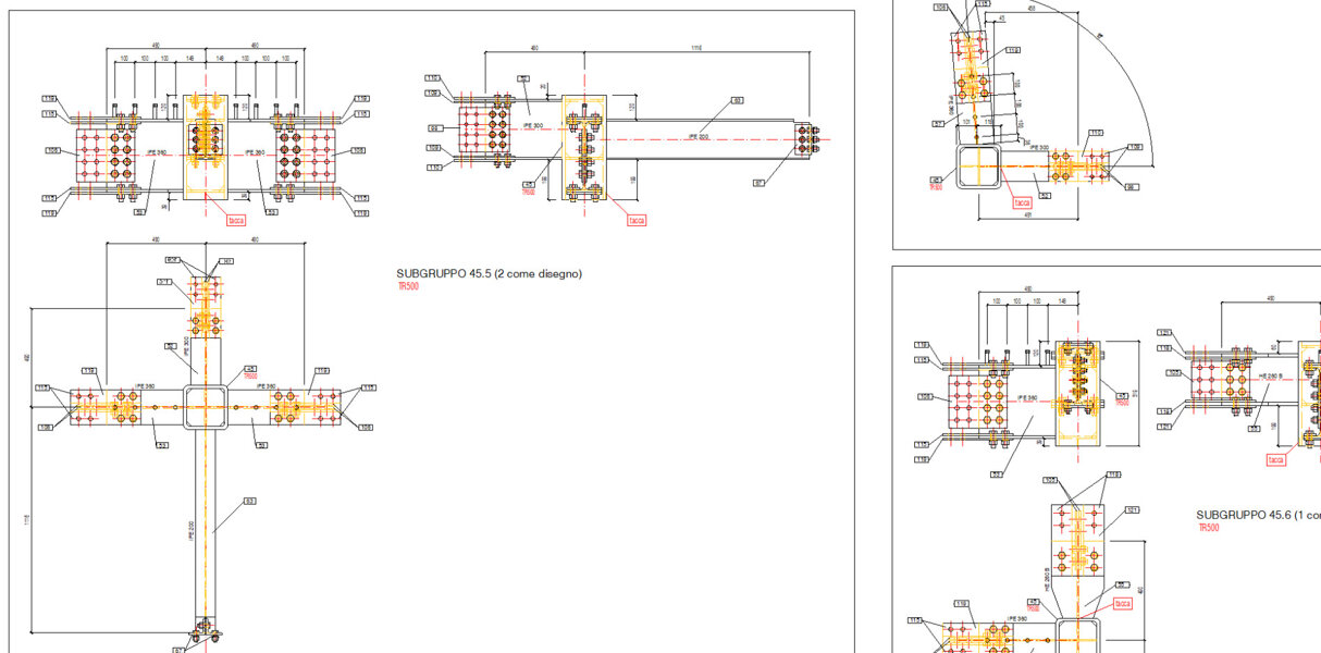 Forniamo tutti gli elaborati necessari alla realizzazione di opere in acciaio e alluminio, comprese le distinte di ordine, le distinte di taglio e di gruppo, i normalini dei pezzi, i disegni dei gruppi e di assieme sino ai disegni di montaggio.